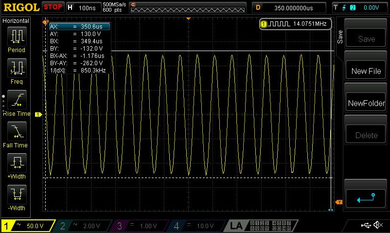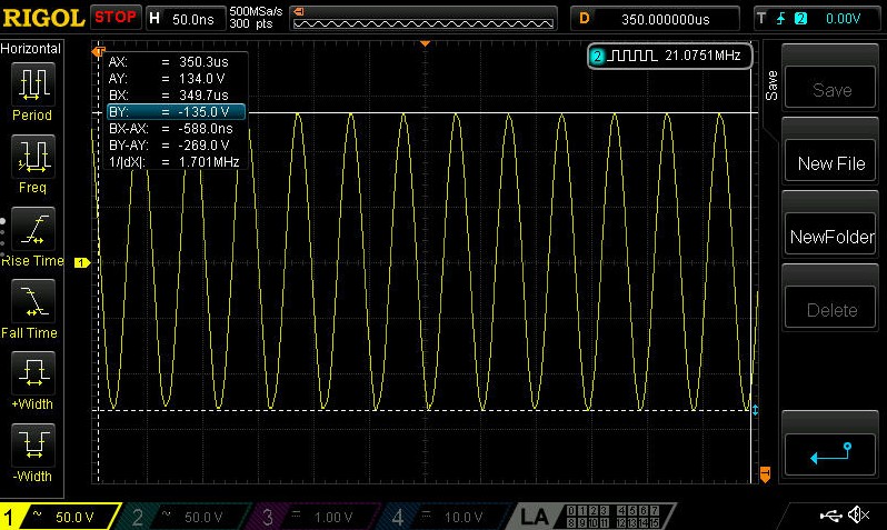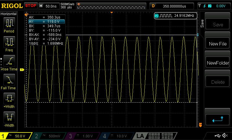 周波数の上限は24MHzあたりでしょうか?137Wrmsあたりに落ちてしまいますね。ただ、波形をみるとそんなにおかしくは見えませんが、いつものπマッチのみのフィルタリングなので、一応、スプリアスを見ておくことにします。