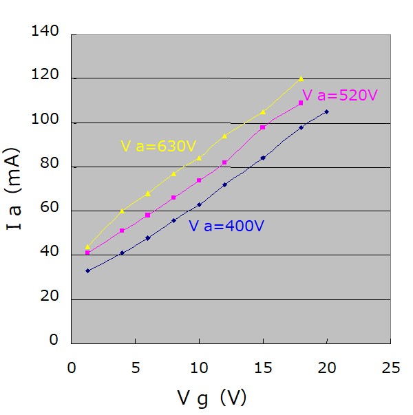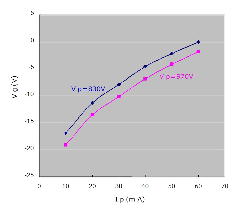 図は横軸と縦軸が逆になってしまっていますが、まぁ雰囲気は解って頂けると思います。Vaがあまり高く掛けられなかったのですが、Vgのカットオフ点はー35V付近で、ゼロバイアスで70mAくらい流れるようです。これだと、カソード(フィラメント)接地型アンプだと若干のマイナスバイアスを掛ける必要がありそうです。