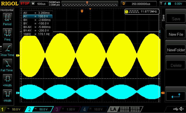 Vaを400~630Vで測定してみました。Paが125Wですから、630Vでも余裕の動作が出来そうです。ここではVgを+15V弱に設定して信号を突っ込んでみました。今度はリニアリティを見るので2-トーンです。