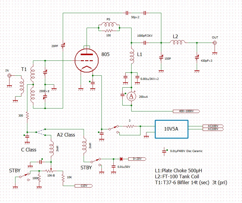 回路図としては、中和付カソード(無いからフィラメントか?)接地型増幅器ということにします。GGでやってもいいのでしょうが、この時期の三極管は増幅度が小さく、811Aのようにまともな利得が得られないケースが多いので、少しでもゲインが取れる回路にしてみました。ただ、中和ようにグリッドに逆相電圧を加えるためのセンタータップが必要なので、これだけで、利得の6dBを失うのは少なからずダメージとはなりますが。