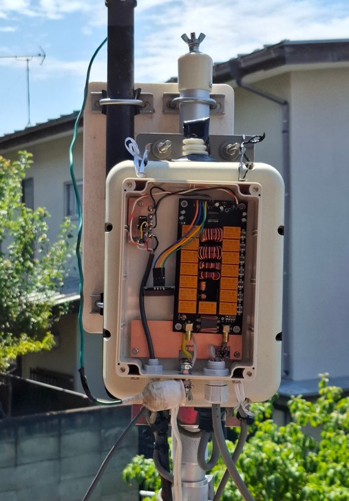 例のタカチの防水ケースに防水の貫通アダプタを実装して、21MHzで動作を見ています。前回と同じように旗竿アンテナを繋いで整合動作していることを確認できました。なので、早速以前の試作品と同様にATU-4の背中に背負って配置してみたのが以下の図です。