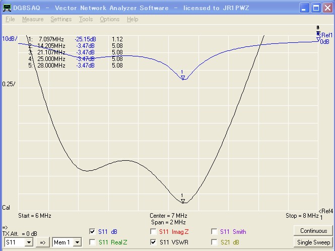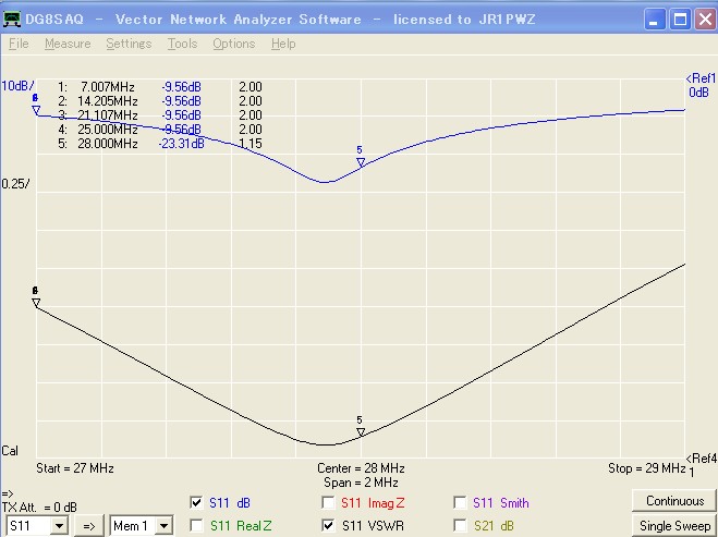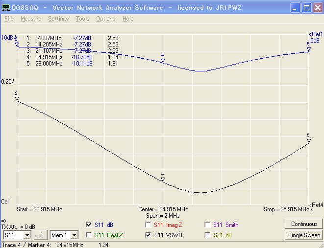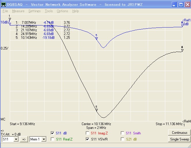 これは支那製の伸縮旗竿(ロッドアンテナとして使用)に整合させている様子です。周波数は21MHzで、VSWRが1.25までしか下がっていませんが、このあと、実際に使うエレメントに繋いで確認してみることにします。