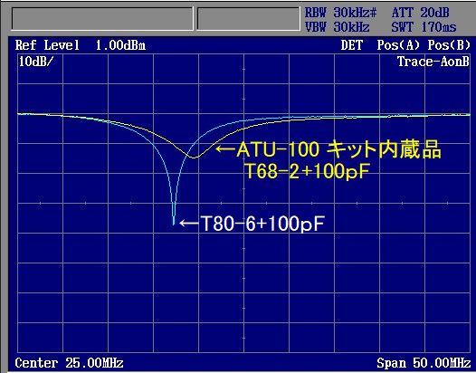 いつもの並列共振回路の共振を見ます。トラッキングジェネレータとスペアナにDUTを介して測定してみると、キット内蔵品のトロコアは共振のディップが少なく、これは本来は∞になる共振インピーダンスが低いことを意味しています。即ち損失が大きいということです。これが、ATU動作でどのように悪さをするのか?ですが、ATUのマッチング回路はフィルタと同様ですので、損失が増加するのかもしれません。