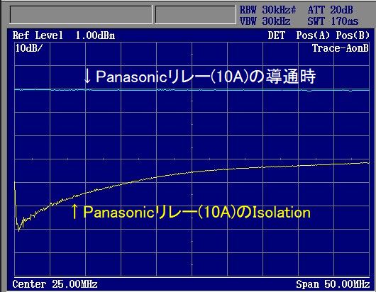さて、次はリレーの特性です。キット内蔵品は見たところ通信用ではない普通のメカリレーに見えます。このアイソレーションのF特性を見ると共に、次のステップの大電力化に備えて、容易に入手できるPanasonicのパワーリレーを見てみます。