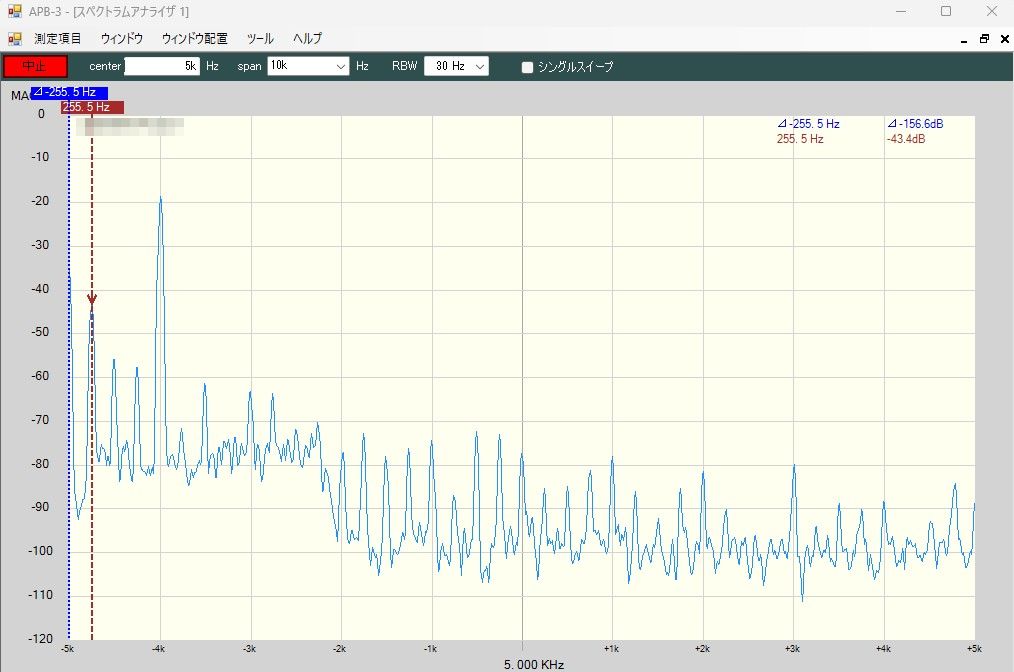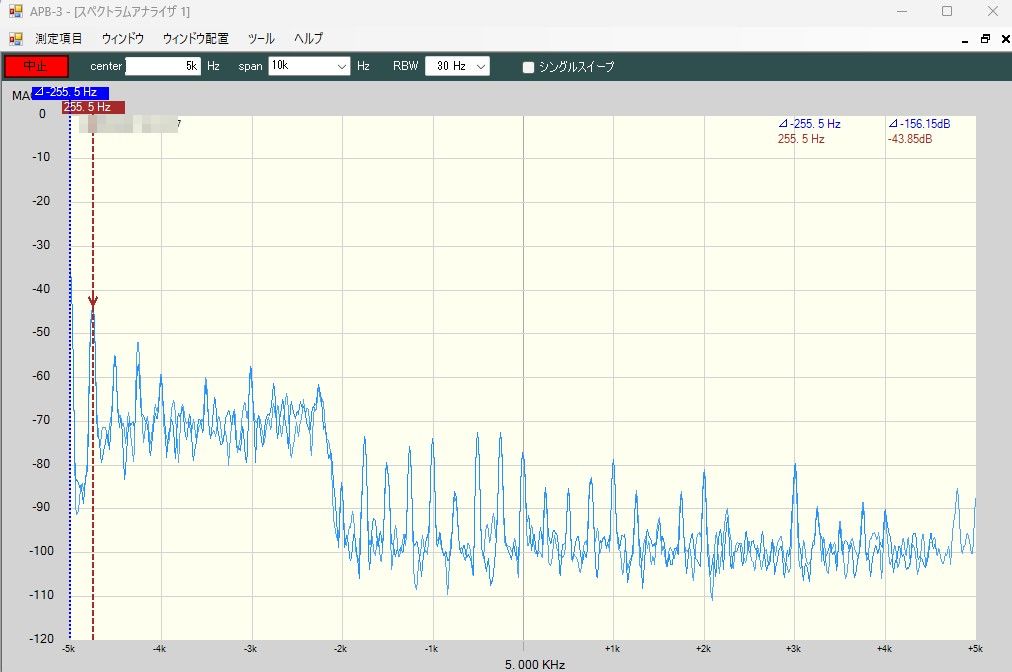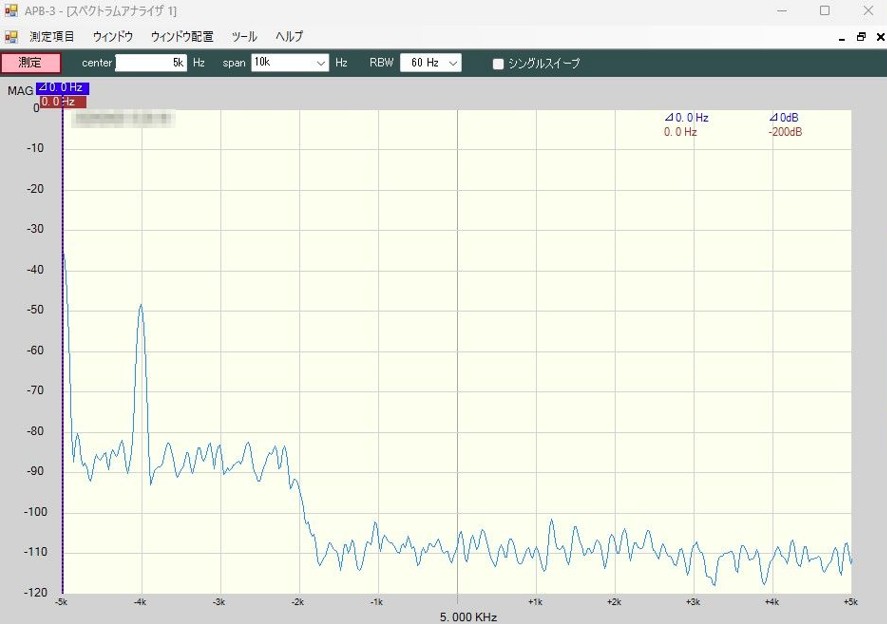 いきなりですが、これはCPU基板とDEM基板を用いて58MHzの-80dBmのキャリアを復調したものです。Fsは96kspsでした。なんだか、受信なのに250Hz?おきに変なスプリアスが見えます。これは信号がなくても残存していて、いろいろ調査をしても、CPU基板から発生しているように思えます。というのも、