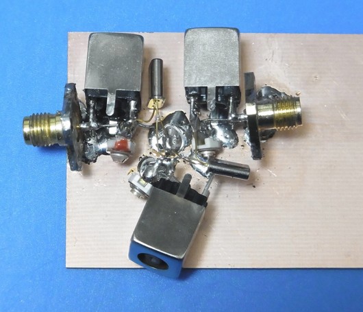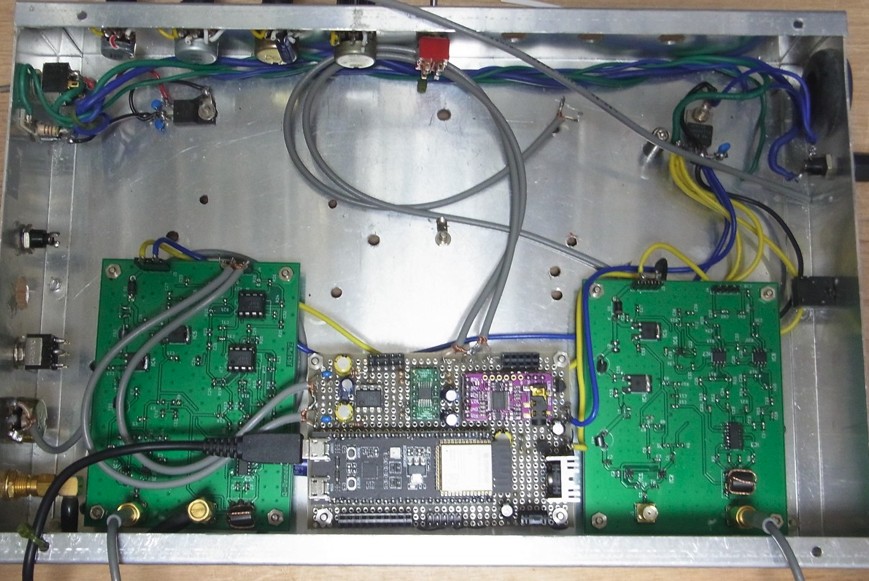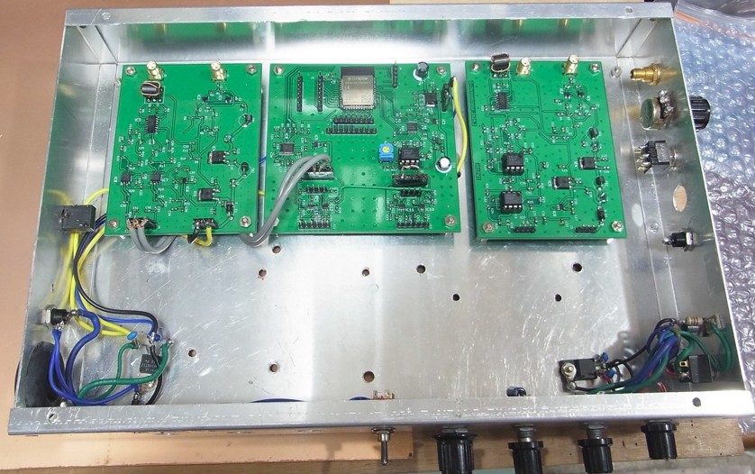 TRXに纏めていくうえで、各基板が固定されていないと、デバッグ、調整のさなかにショート事故のような、再起不能なアクシデントに見舞われることを避けるためです。以前にJF3HZB方式SDR基板の評価にも使ったもので、なにやら当時のスイッチやVRがついていますが、これは評価をする時に一次的に再利用できるでしょう。