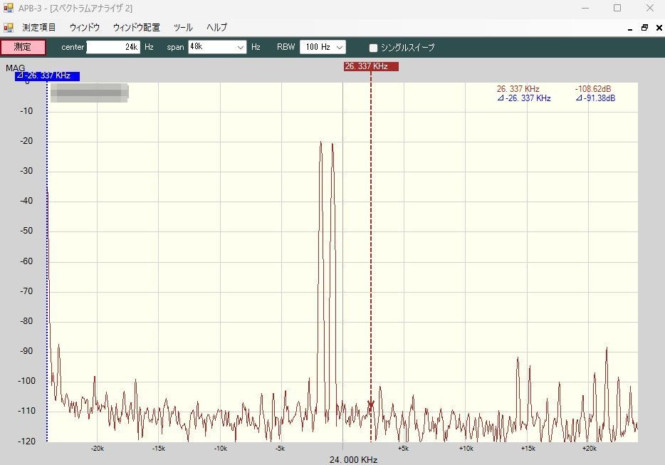 Low-IFの24KHzで2-トーンを発生させてみました。高域にざわつきが見られますが、これは58MHzのルーフィングフィルタでバッサリ切れますから全く気にする必要はありません。キャリアサプレッションもサイドバンドサプレッションもまったく問題ありません。何度も書きますが、アナログ時代はえらい苦労をしたのに、ディジタルだと全く気にする必要がないのは良いことです。これで当面は安心して実験ができそうです。