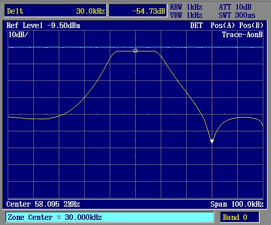偶然、見つかったのが上記のフィルタです。58MHzというと大昔のアナログTVの第一IF周波数が58.75MHzだったと思いますが、どうもその周波数とは離れています。なので、特注品なのかもしれません。日米商事で入手した覚えがありますが、今となってはその素性は全く解りません。これをフィルタとして組んでみます。