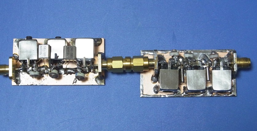 ということで、同じフィルタを2組作って、単純にシリーズ接続してみることにしました。無線機としてくみ上げるときはこのようにシリーズ接続をするわけでもなく、TX/RX共にフィルタ(2素子)の間にアンプを挟み込む構造になります。 なにはともあれ、このフィルタの特性を以下に示します。