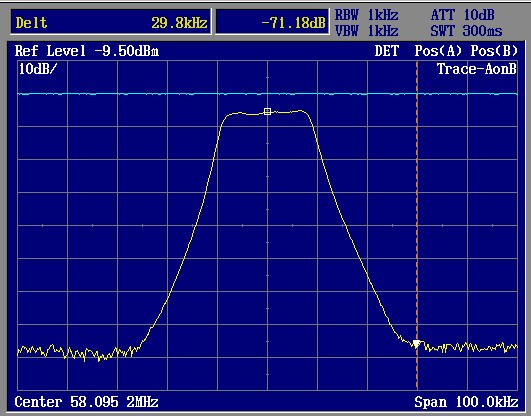 入力は58MHzの-100dBmの様子です。すっかり変なスプリアスは影を潜めていい感じで復調されていますね。CPU以外の条件は先の例と同じです。次に、基本的な送信スペクトラムを見ます。